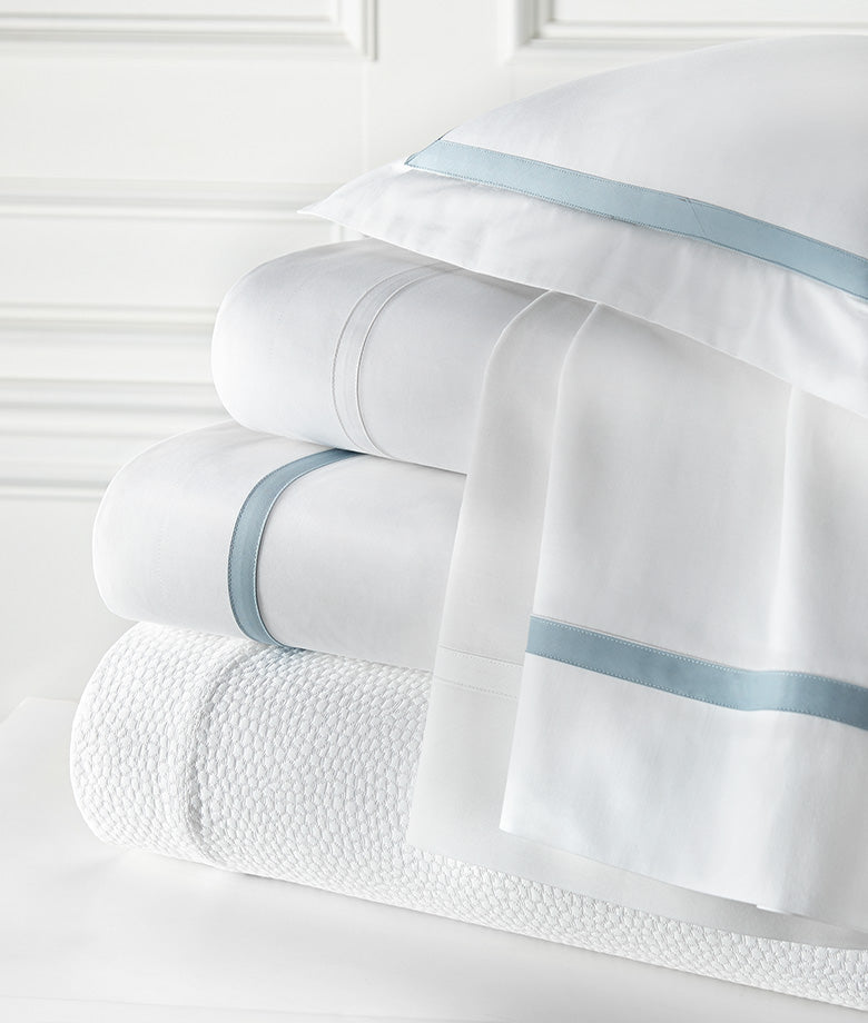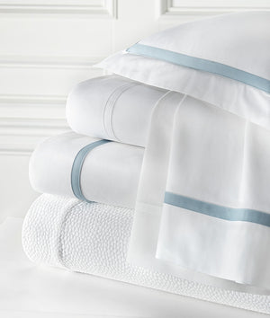 Lafayette, from Legacy Home's Arcadia collection, a fretwork tape design available on their Floris Percale sheeting.