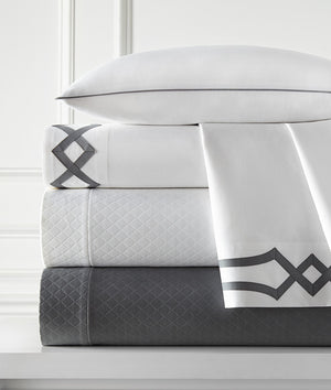 Rylan, from Legacy Home's Arcadia collection, a refined Neo Classic appliquéd fretwork tape design on their sumptuous Floris extra long staple cotton sheeting.
