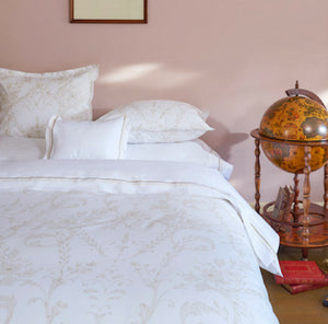 What could be better than a beautiful print on crisp white percale? Aurora is a large-scale floral design with a serene and romantic feel. It is one of our favorites - open and airy with scrolling tendrils and leaves on a white background.