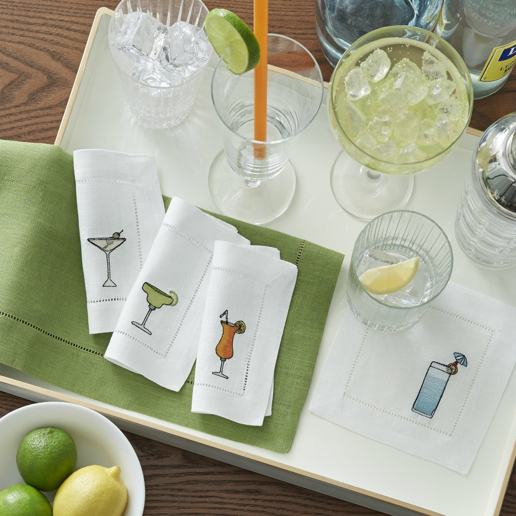 Bevande cocktail napkins were created as a whimsical homage to all that makes the evening flow: pure white, hemstitched linen that says sophistication, with colorful embroidery of the drinks being served. Each collection includes a Martini, Margarita, Orange Crush and Blue Hawaiian napkin.