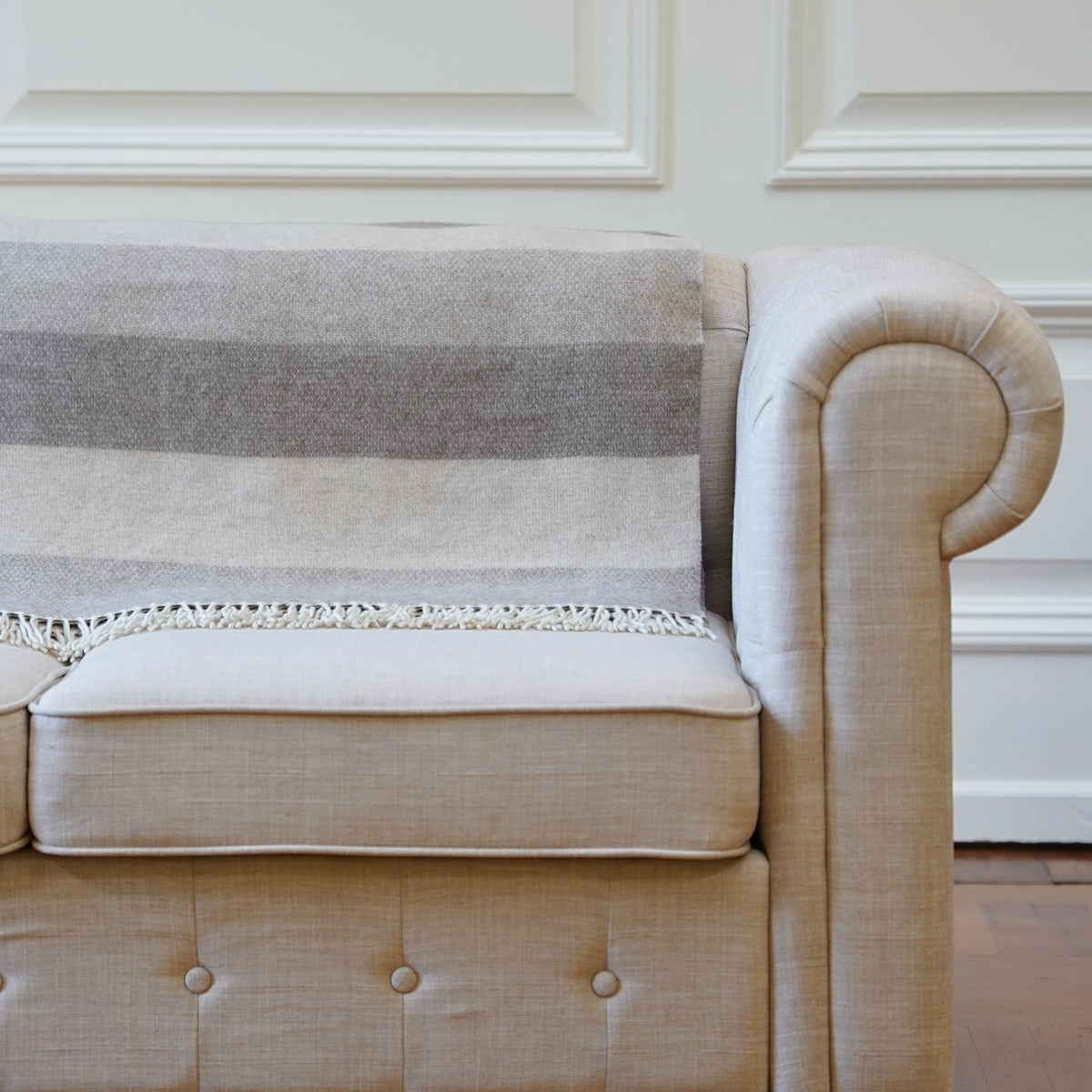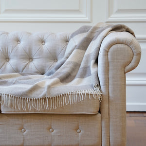 Cobi Caffe throws feature a tonal stripe design with a fringe at the edge. Woven in Italy by master craftsmen, using luxuriously soft cashmere yarns. Light weight and lovely at 290gr.