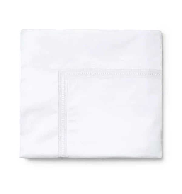 590 Thread Count Sateen with macrame lace inset. Flat Sheet and Pillowcases: Lace along cuff. (Hemstitched). Made in Italy
