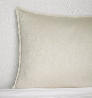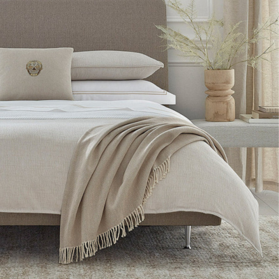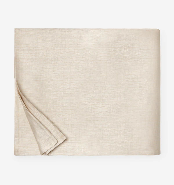 Dresano’s luminous threads trace an open-weave pattern over a subtly textured, alabaster jacquard base. Mini-flange finishing.