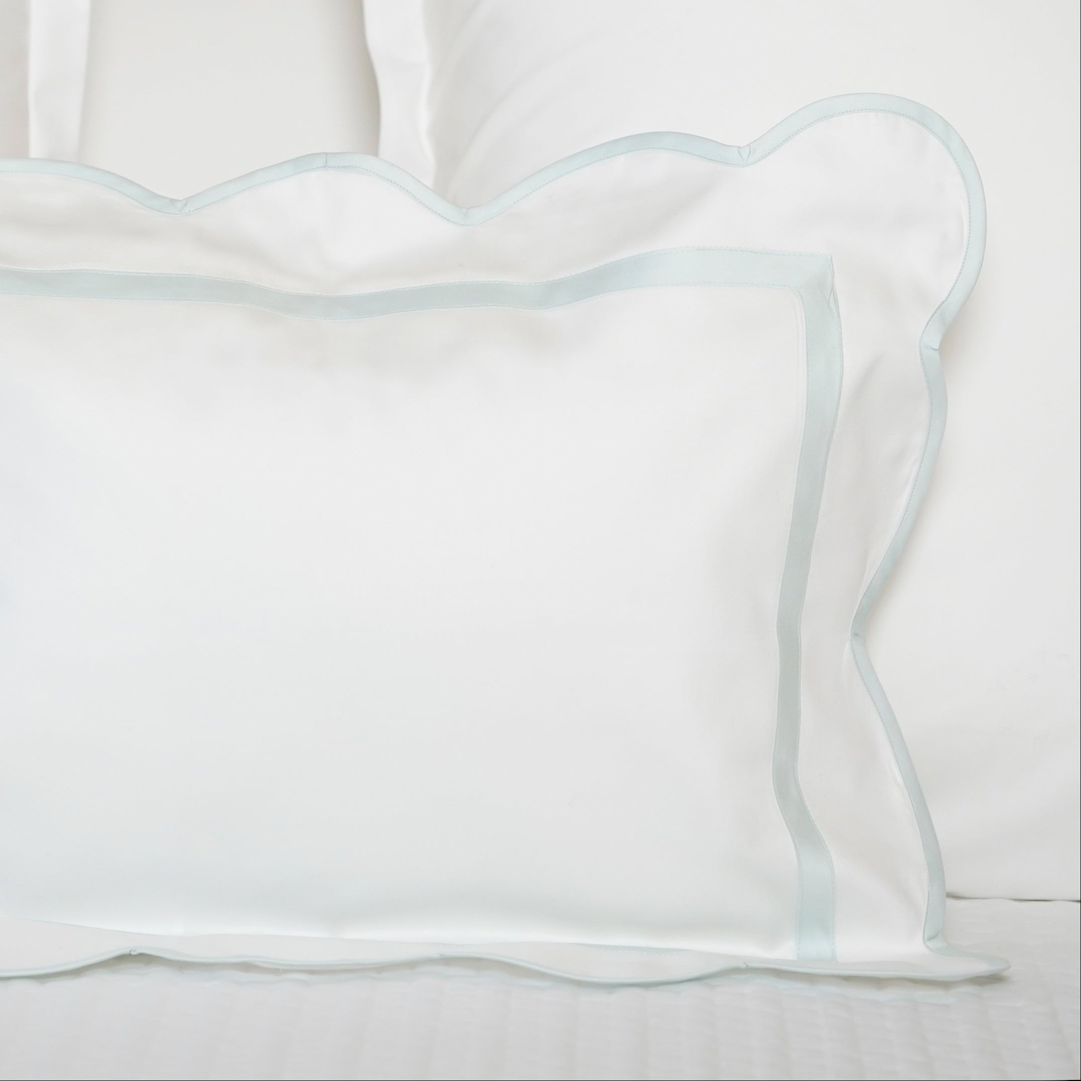 Duvet Cover is "U-Shaped" Trimming on top of the bed. Shams are 4-sided framed trimming on flange and at the seam of the flange.