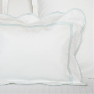 Elisabetta features contrast color scalloped trim flanges and a matching narrow inset band of applique.