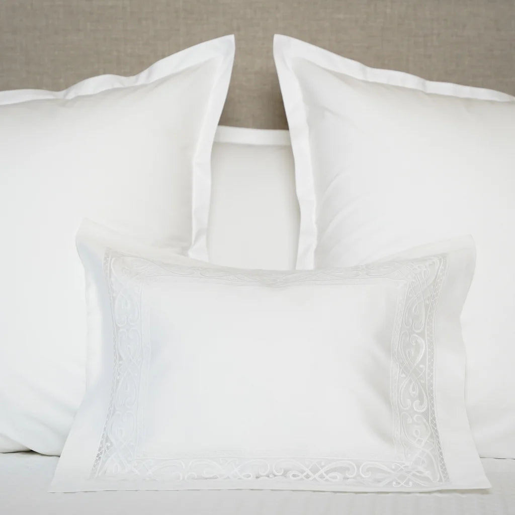 A delicate lace detail that brings luxury to any room. This item can be customized further, if of interest please call the store at (203)-629-3659. Duvet Cover is "U-Shaped" wider scale embroidery on top of bed, knife edge with button closure. Shams are embroidered on all 4-sides.