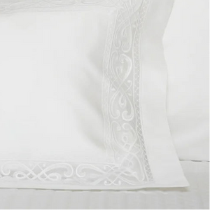 A delicate lace detail that brings luxury to any room. Duvet Cover is "U-Shaped" wider scale embroidery on top of bed, knife edge with button closure. Shams are embroidered on all 4-sides.