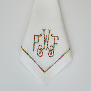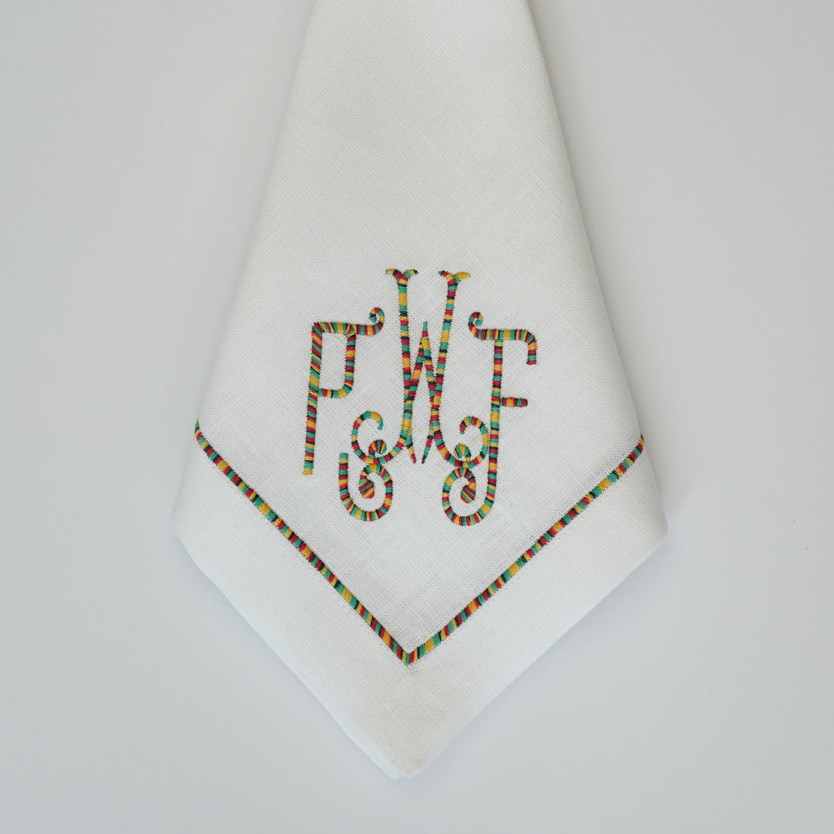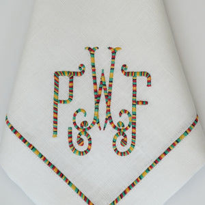 Available in a classic design as shown, these napkins can also be customized with your preferred ribbon color and monogram style. For custom colors, please contact our store directly at 203-629-3659. To add a custom monogram, orders must be placed by phone or by emailing your request to sales@lynnens.com. Please include your desired monogram details in your message.