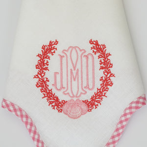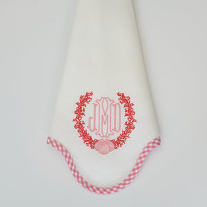 Available in a classic design as shown, these napkins can also be customized with your preferred ribbon color and monogram style. For custom colors, please contact our store directly at 203-629-3659. To add a custom monogram, orders must be placed by phone or by emailing your request to sales@lynnens.com. Please include your desired monogram details in your message.