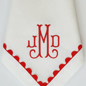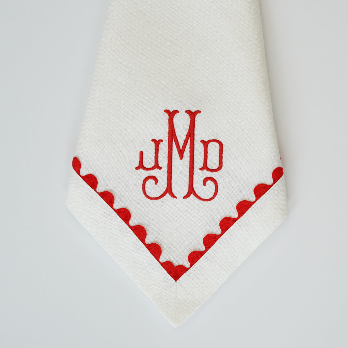 Available in a classic design as shown, these napkins can also be customized with your preferred ribbon color and monogram style. For custom colors, please contact our store directly at 203-629-3659. To add a custom monogram, orders must be placed by phone or by emailing your request to sales@lynnens.com. Please include your desired monogram details in your message.
