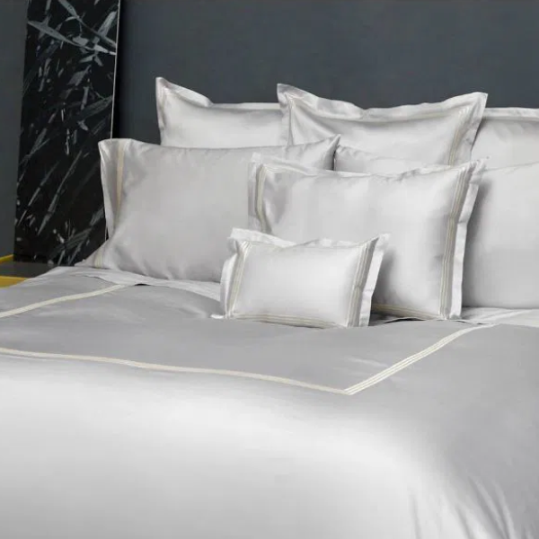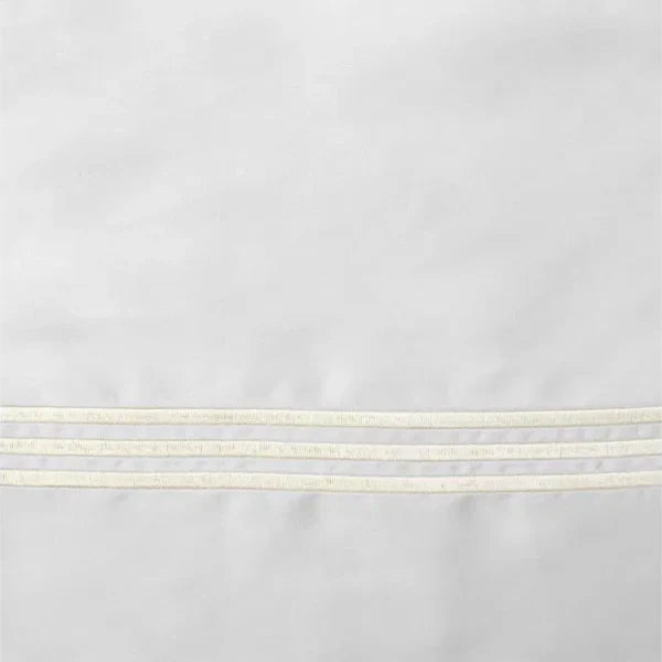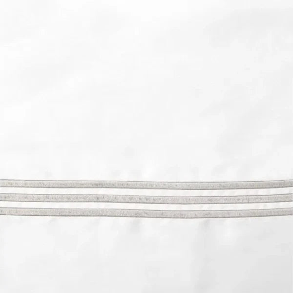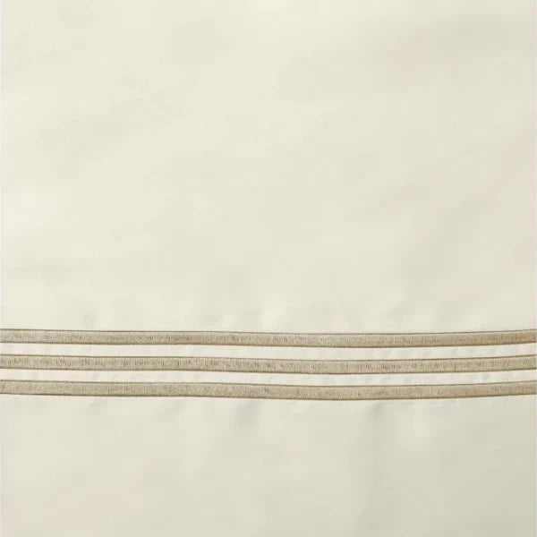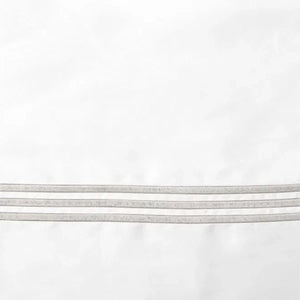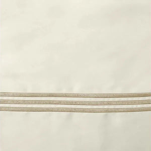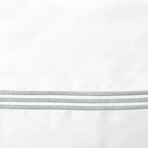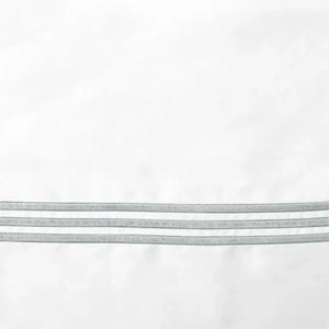 The Platinum Sateen Flat Sheet reinterprets the traditional three lines embroidery with a more contemporary style due to its use of color combinations. Made with the sublime Signoria long-staple cotton 300 t.c. sateen. Duvet Covers are U Shape with knife edge and button closure with ties inside, shams have 1" flanges with three line embroidery all around.