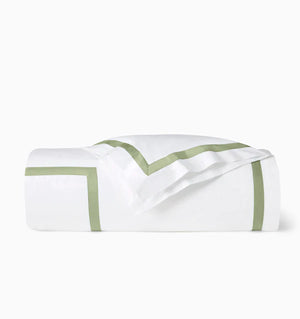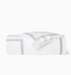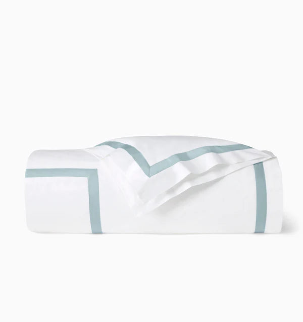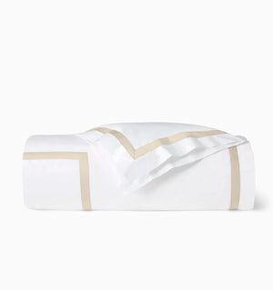The understated sophistication of Estate's crisp white, Italian-woven long-staple cotton base is an immaculate backdrop for lustrous sateen appliqué detail, beautifully bordering this collection to create a sense of tailored elegance. Duvet Cover is U-Shape on top of the bed, knife edge finish. Shams have a 3 inch flange.